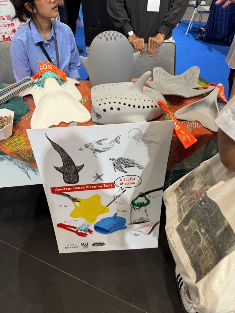 ในงานที่เราได้ไปเยี่ยมชมบูธต่าง ๆ ซึ่งแต่ละโครงการที่นำเสนอในงานนั้น ล้วนสะท้อนถึงความพยายามในการแก้ไขปัญหาและขับเคลื่อนเป้าหมายการพัฒนาที่ยั่งยืน โดยเริ่มจาก บูธแรก เป็นบูธของโครงการ Nets Up ซึ่งได้นำเสนอชุดอุปกรณ์เก็บขยะทะเลที่ชื่อว่า “Amateur Waste Picker นักเก็บขยะมือสมัครเล่น” ออกแบบมาเพื่อให้ทุกคนสามารถเข้าร่วมกิจกรรมเก็บขยะเพื่อรักษาสิ่งแวดล้อมได้อย่างสนุกสนานและง่ายดาย โดยเฉพาะมือสมัครเล่น ทั้งเด็กและผู้ใหญ่สามารถร่วมมือกันเก็บขยะทะเลได้โดยไม่รู้สึกเครียด ด้วยอุปกรณ์ที่มีรูปทรงน่ารักเป็นสัตว์ทะเล เช่น ปลา ฉลาม และเต่าทะเล ชุดอุปกรณ์นี้ประกอบไปด้วยเครื่องมือที่ช่วยให้การเก็บขยะเป็นเรื่องง่าย เช่น Scoop สำหรับตักขยะ, Drag สำหรับลากขยะ, Filter สำหรับกรองขยะ, และ Grab สำหรับจับขยะ การใช้วัสดุจากขยะทะเลที่สามารถรีไซเคิลได้ ทำให้โครงการนี้ไม่เพียงแต่ช่วยลดมลพิษในทะเล แต่ยังสร้างการตระหนักรู้ถึงความสำคัญของการรักษาสิ่งแวดล้อม โครงการ Nets Up เชื่อว่าการทำความสะอาดทะเลไม่จำเป็นต้องเป็นกิจกรรมที่เครียด แต่สามารถเป็นกิจกรรมที่ทุกคนร่วมมือกันเพื่อโลกที่ดีกว่าได้