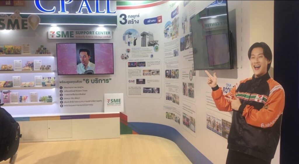บูธถัดไป ที่ทางกลุ่มพวกเราไปรับชมนั่นคือบูธของ 7-11 (CP ALL) ที่มีโครงการเกี่ยวกับการส่งเสริม SME ทั่วประเทศ สิ่งที่น่าสนใจอีกอย่างของบูธนี้นั่นคือ 7-11 มีกลยุทธ์ 3 สร้าง เพื่อเป็นที่พึ่งให้กับชุมชน ได้แก่