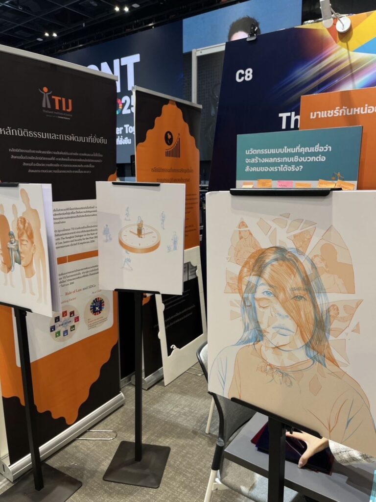 บูธสุดท้าย ที่เราจะพูดถึงคือ บูธของสถาบันเพื่อการยุติธรรมแห่งประเทศไทย (TIJ) โดย TIJ ก่อตั้งปี 2554 เพื่อวิจัยและพัฒนากระบวนการยุติธรรมไทยให้สอดคล้องกับมาตรฐานสากล ผลักดัน “ข้อกำหนดกรุงเทพ” และมาตรฐานสหประชาชาติในการดูแลผู้ต้องขังหญิง เด็ก และสตรี ขับเคลื่อนประเด็นนิติธรรม สิทธิมนุษยชน และสันติภาพในเวทีนานาชาติ เป็นเครือข่าย UN ลำดับที่ 18 ของโลก และแห่งแรกในอาเซียนที่เน้นป้องกันอาชญากรรมและส่งเสริมหลักนิติธรรม ภารกิจของ TIJ สอดคล้องกับเป้าหมายการพัฒนาที่ยั่งยืน (SDGs) ข้อที่ 16 ที่มุ่งส่งเสริมความยุติธรรม สันติภาพ และสถาบันที่เข้มแข็งอย่างทั่วถึง ในงานนั้น บูธของ TIJ ได้นำภาพถ่ายและสื่อที่สะท้อนปัญหาของผู้ต้องขังหญิงและกลุ่มเปราะบางในเรือนจำมาจัดแสดง เพื่อสร้างความเข้าใจและตระหนักรู้ให้กับผู้เข้าชมเกี่ยวกับความยากลำบากและข้อจำกัดที่พวกเขาเผชิญ รวมทั้งส่งเสริมความเห็นใจและความตระหนักในความสำคัญของการปฏิบัติที่เป็นธรรมในกระบวนการยุติธรรม