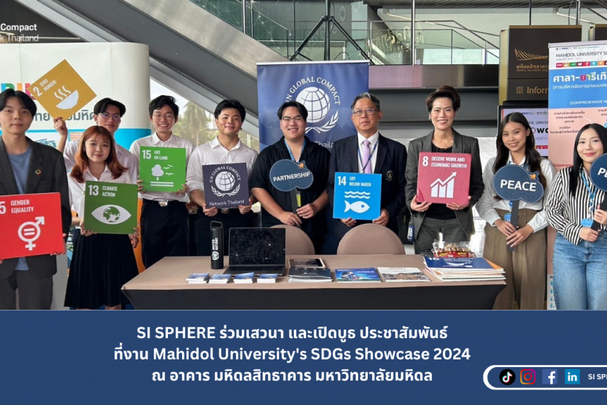 SI SPHERE เข้าร่วมเสวนา และเปิดบูธ ประชาสัมพันธ์ที่งาน “Mahidol University’s SDGs Showcase 2024” ณ อาคาร มหิดลสิทธาคาร มหาวิทยาลัยมหิดลศาลา เพื่อเป็นส่วนหนึ่งในการสนับสนุนและประชาสัมพันธ์โครงการต่าง ๆ ที่จะนำไปสู่การสร้างการรับรู้ในด้านของ SDGs และการบรรลุเป้าหมาย SDGs ในอนาคต